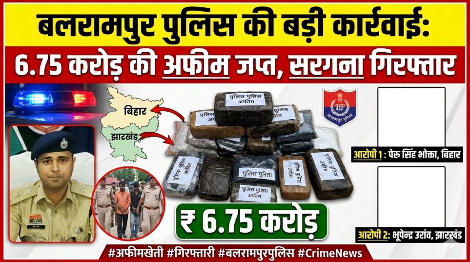अवैध मादक पदार्थों के खिलाफ चलाए जा रहे अभियान में बलरामपुर पुलिस को एक बड़ी सफलता हाथ लगी है। पुलिस ने “एंड टू एंड” विवेचना (पूरी कड़ियों को जोड़ने वाली जांच) के माध्यम से अफीम की खेती के मामले में संलिप्त दो मुख्य सरगनाओं को बिहार और झारखंड से गिरफ्तार किया है। इस मामले में पुलिस पहले ही 09 आरोपियों को जेल भेज चुकी है।