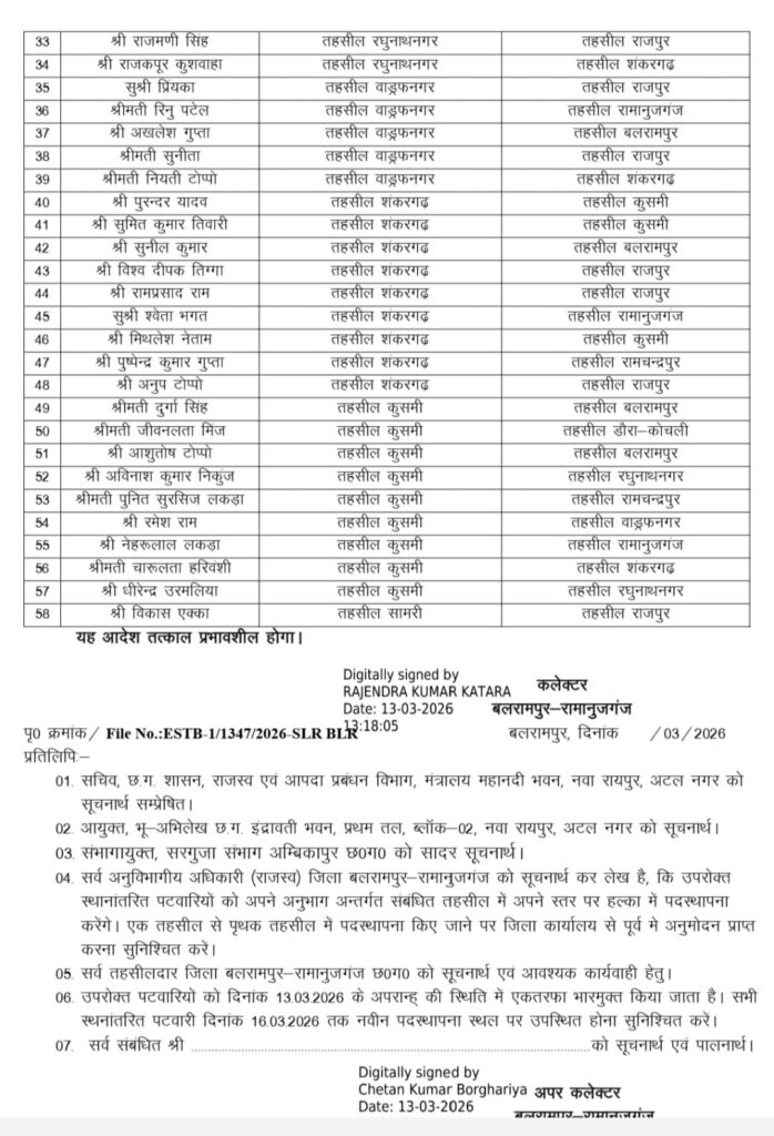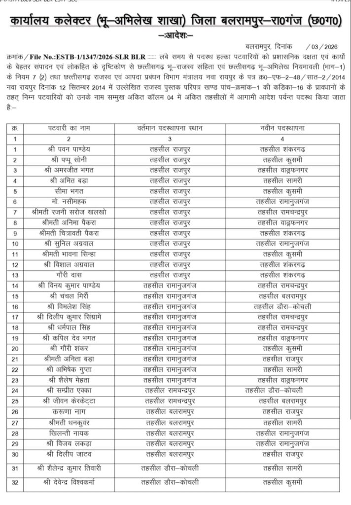 बलरामपुर में पटवारियों का बड़ा फेरबदल, कलेक्टर के निर्देश पर कई का तबादला