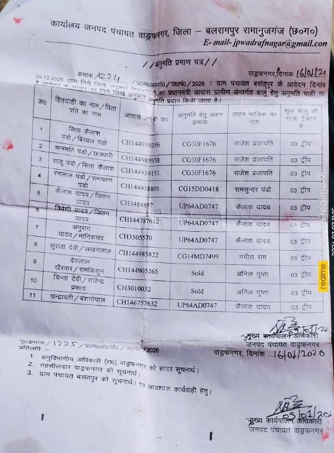 बलरामपुर जिले के अंतर्गत वाड्रफनगर विकासखंड के बसंतपुर क्षेत्र में प्रधानमंत्री आवास योजना के तहत निर्माण कार्य के लिए बालू-रेता ढुलाई को लेकर एक नया विवाद सामने आया है। बसंतपुर निवासी एक ट्रैक्टर मालिक ने थाना प्रभारी पर गंभीर आरोप लगाते हुए कहा है कि वैध अनुमति होने के बावजूद उसके ट्रैक्टर को जब्त कर चालान कर दिया गया। इस मामले को लेकर क्षेत्र में चर्चा का माहौल बन गया है और लोगों ने निष्पक्ष जांच की मांग उठाई है।