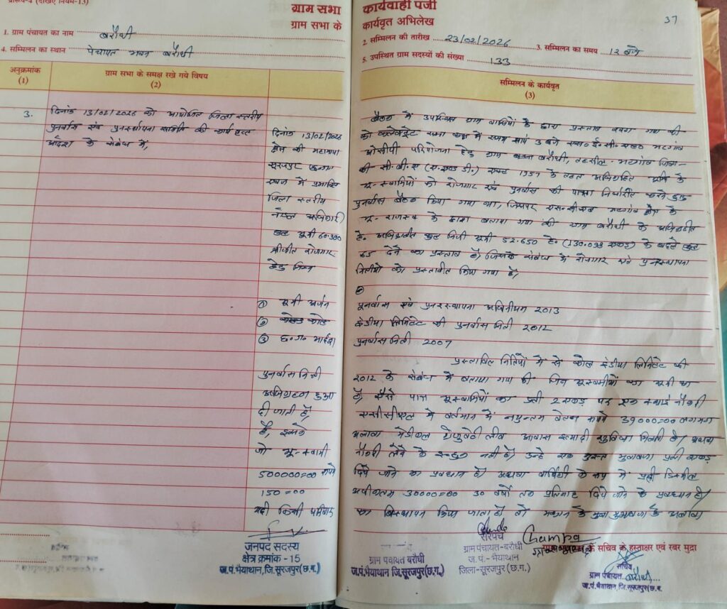 भारत सम्मान/भटगांव/फिरोज खान:-जिले के ग्राम पंचायत बरौधी में 23 फरवरी 2026 को आयोजित ग्राम सभा में SECL परियोजना से प्रभावित परिवारों के मुद्दों पर व्यापक चर्चा के बाद सर्वसम्मति से प्रस्ताव पारित कर जिला कलेक्टर को ज्ञापन सौंपा गया। पंचायत भवन में दोपहर 12 बजे आयोजित इस बैठक में 133 ग्रामीणों की उपस्थिति रही, जहां रोजगार, पुनर्वास, मुआवजा और प्रशासनिक आश्वासनों पर गंभीर सवाल उठे।
